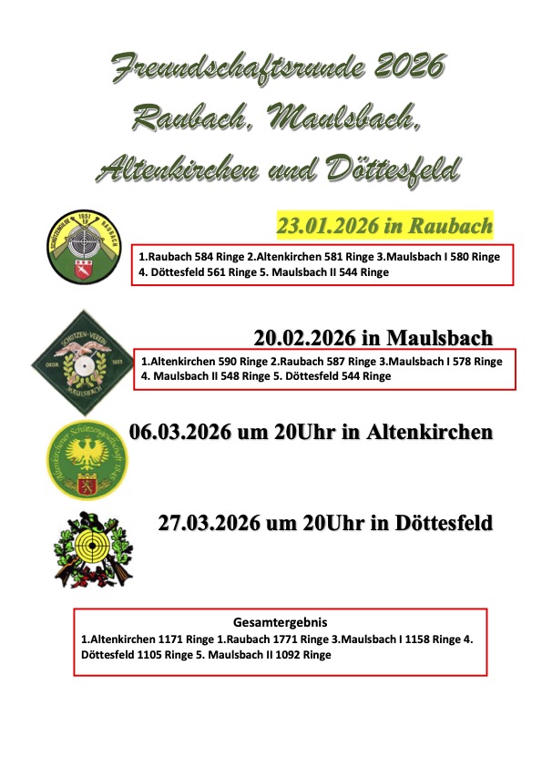 Jahreshauptversammlung am Freitag den 6. Februar 2026 um 19:30 Uhr im Vereinsheim der Schützengilde Raubach 1951 e.V. Gemäß § 16 Abs. 1 der Satzung laden wir hiermit alle Mitglieder zur […]