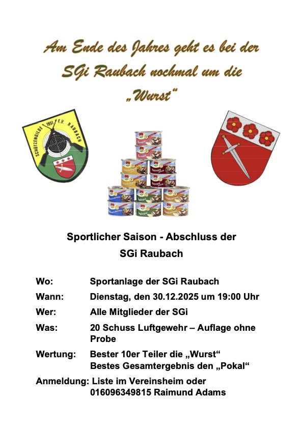 Am 30.12 wird unter allen teilnehmenden Vereinsmitgliedern der SGi der Wurstkönig ermittelt. Wie üblich werden 20 Schuß mit dem Luftgewehr mit Auflage abgegeben, ohne Probe. Der beste 10er Teiler gewinnt die Wurst und wird Wurstkönig – oder Wurstkönigin – der oder die Teilnehmer/In mit dem besten Gesamtergebnis gewinnt den Pokal.