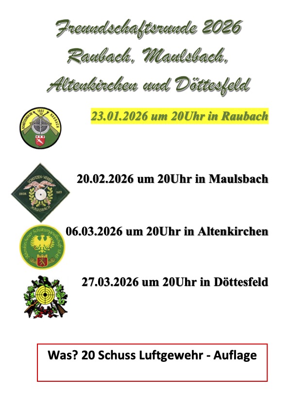 Geschossen werden 20 Schuß mit dem Luftgewehr, aufgelegt, auf dem Stand der teilnehmenden Vereine. Teilnehmen kann jedes Vereinsmitglied – auch ohne Vorkenntnisse und/oder eigener Waffe. Den Anfang im Kalender macht die Runde am 23. Januar bei uns in Raubach und zieht dann einmal durch die „Nachbarschaft“, bis Ende März der Sieger feststeht. Am 27. März findet der Freundschaftswettkampf bei unseren Freunden in Döttesfeld dann seinen Abschluß. Wir freuen uns über Schlachtenbummler und zahlreiche Unterstützung im Raubacher „Fanblock“.